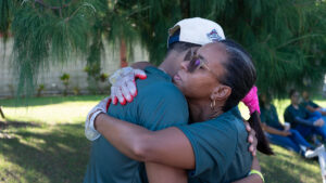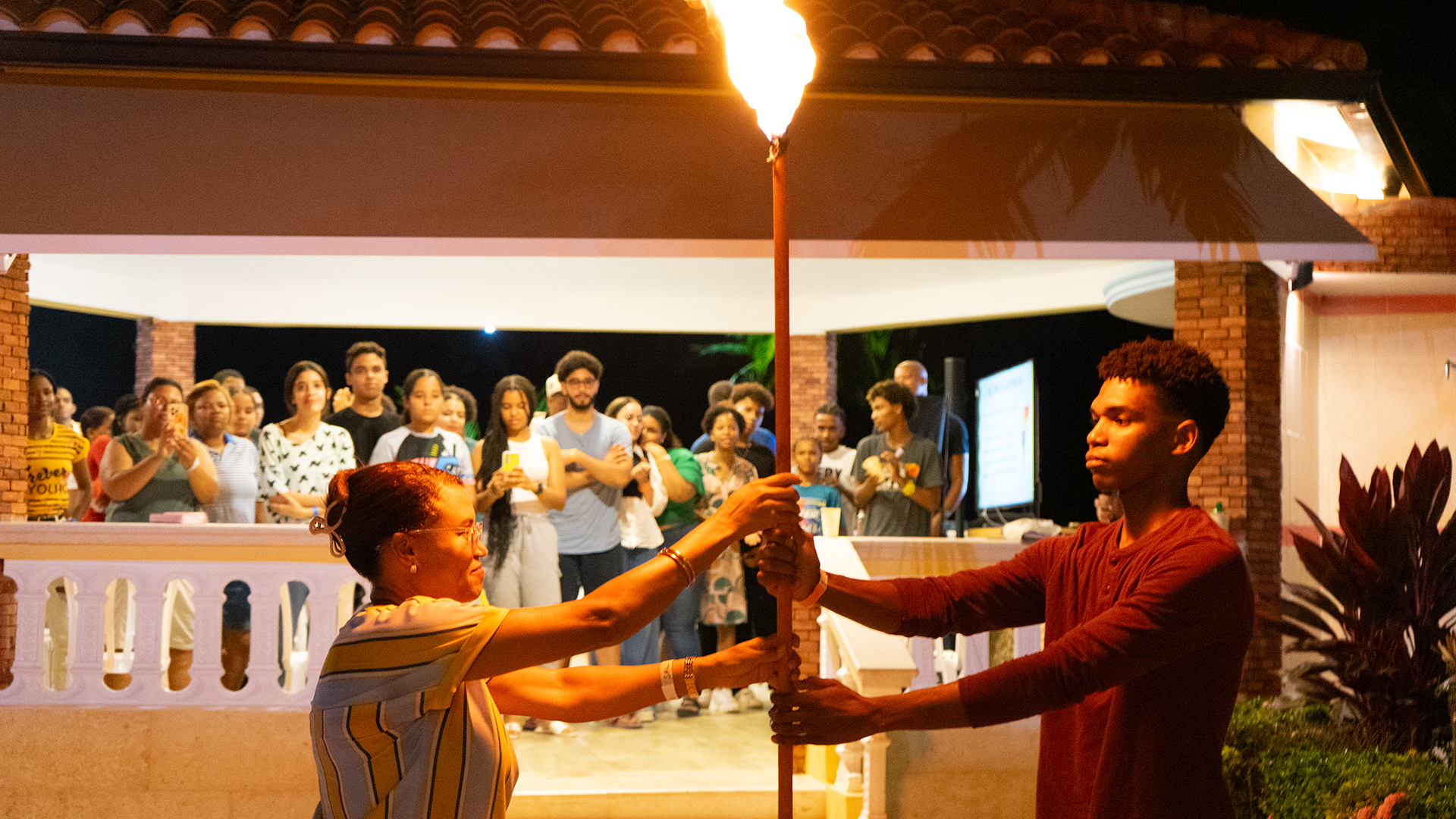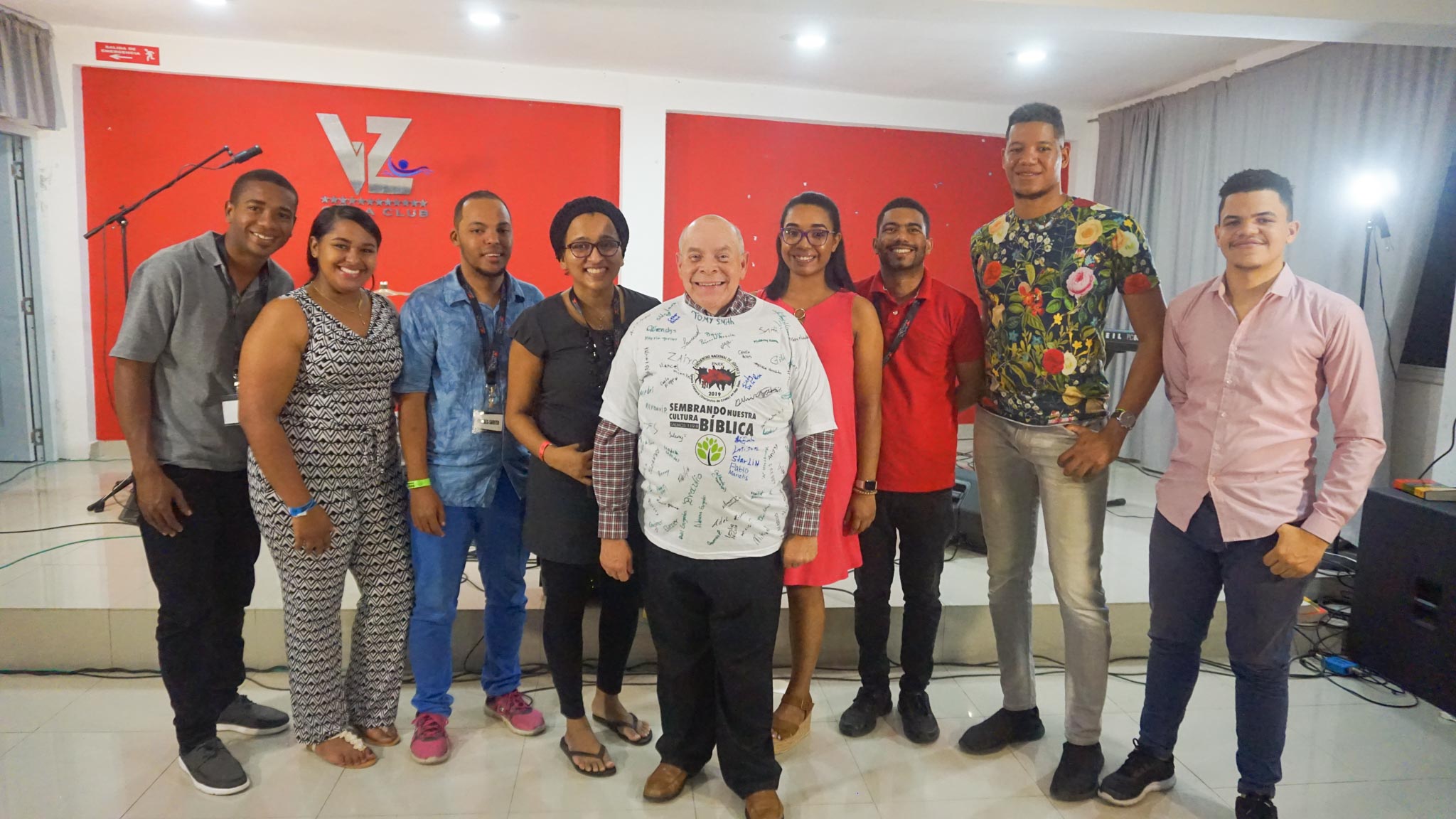 El diseño circular enmarca el evento con un sentido de unidad y pertenencia: la Iglesia como comunidad que abraza y acompaña. La República Dominicana marcada en rojo en la parte inferior conecta el mensaje universal del evangelio con un contexto local y concreto, invitando a los jóvenes a ser luz en su propia tierra.